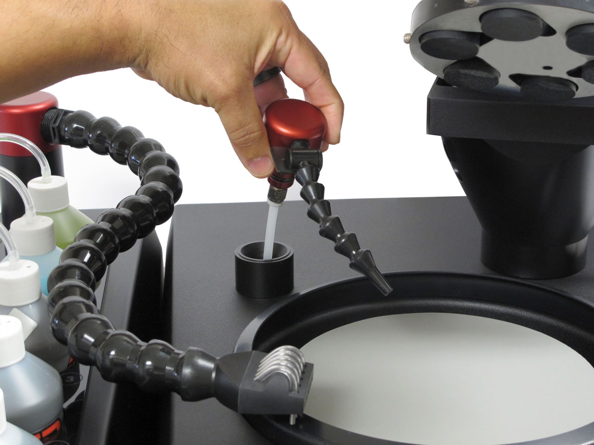 AD-5有5个定位配送装置,其中两个包含冲洗循环装置,以防止使用胶体悬浮液时堵塞。同时蠕动泵技术使得抛光表面不会产生雾气水滴。
