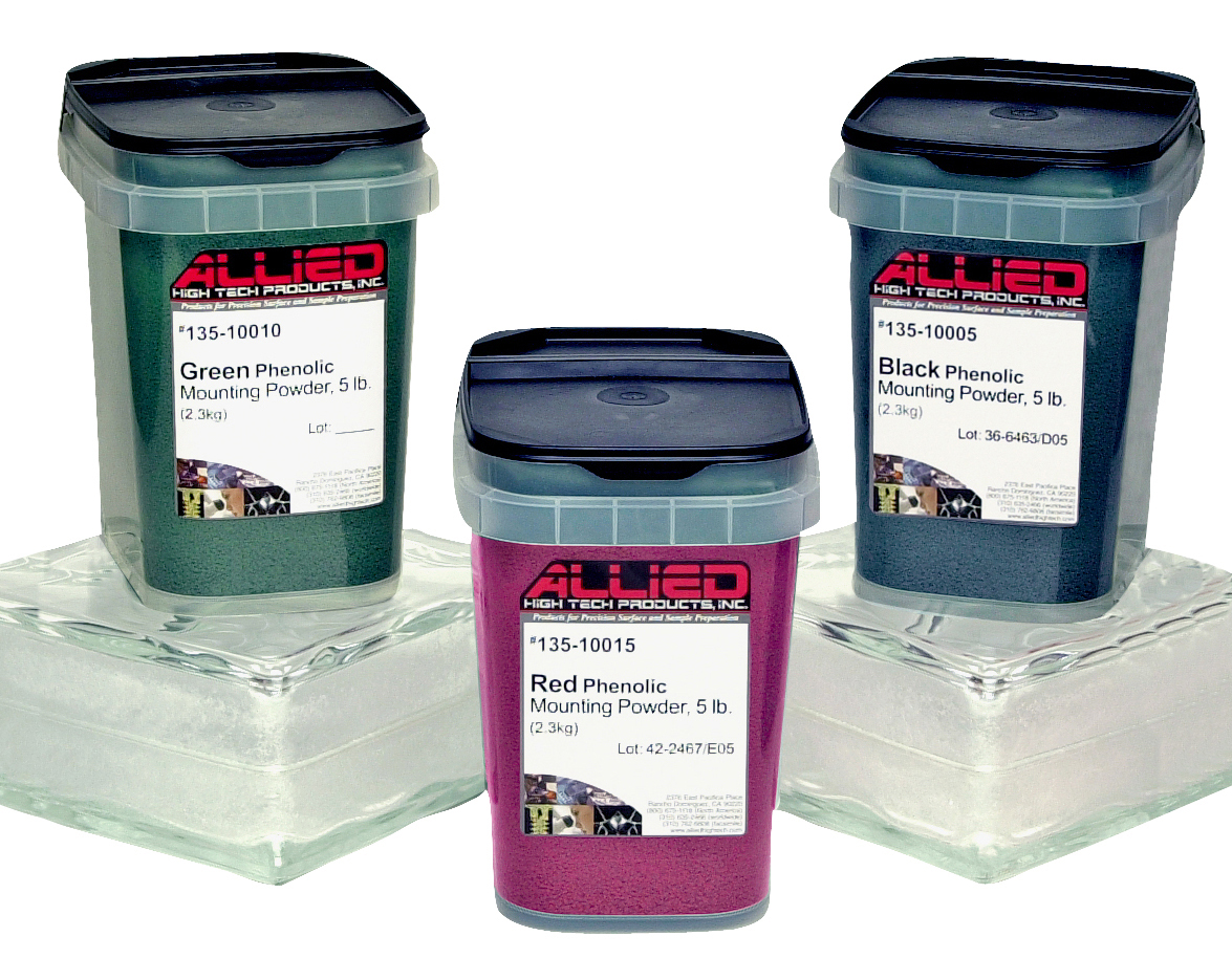 黑色,绿色和红色酚醛粉用于对材料进行常规应用时的颜色编码,或者作为其他较贵的镶样粉的填充。