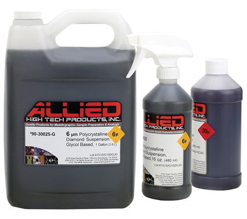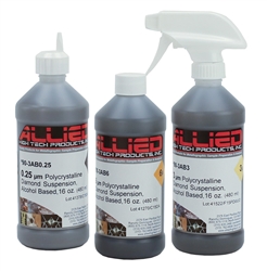 Allied的金刚石悬浮液是专门配制的以确保金刚石颗粒在稳定的载体液中保持悬浮和分离。它们使金刚石容易、均匀的分布在抛光布或研磨盘表面。所有8和16盎司瓶都包含可翻瓶盖和扳机式喷雾器用于喷出悬浮液。1加仑的包含有刻度线的16盎司空瓶以方便配药。