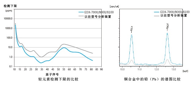 从轻元素到重元素,全范围轻松应对。与采用传统Si(Li)半导体检测器的分析装置相比,灵敏度也更胜一筹。