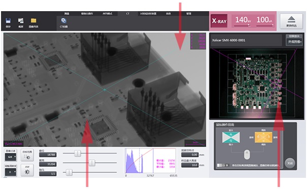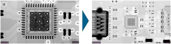 只需点击X射线图像上的任意一点,就可以对载物台进行全行程的移动控制。包括 XY·倾斜·旋转以及变更视野大小等。使用外观图像定位