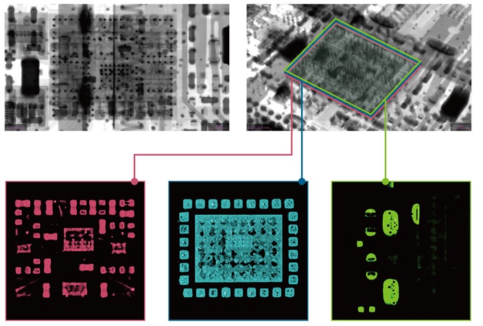进行X射线透视时,射线方向(一般为样品厚度方向)上的信息会重叠,如果样品为双面实装基板,则无法分辨观察点处于基板的哪一面,但如果使用X射线CT模式检测,就可以对每个层面单独进行观察。