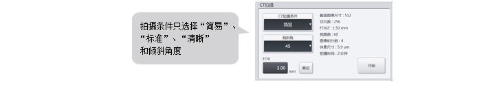 只需选择菜单图标便可轻松实现X射线透视与CT拍摄之间的切换。CT拍摄的条件设置十分简单,只需选择拍摄模式、拍摄角度、拍摄视野即可完成。在透视检查中希望观察的点可立刻顺畅切换至CT观察模式。