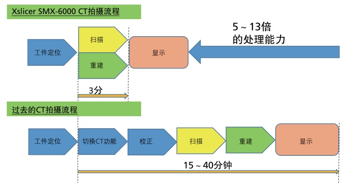顺畅的切换将透视观察和断面观察快速连接在一起,全新的CT处理引擎能够进行全自动校准、高速拍摄以及重构。