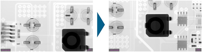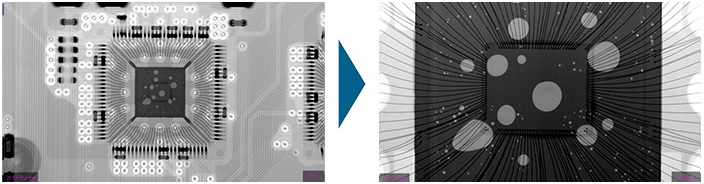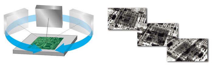 当平板检出器倾斜时,载物台一边进行360度旋转,检出器一边采集X射线透视图像,利用采集的透视图像进行重建演算,形成截面图像。如果只使用X射线透视进行观察,由于在射线方向的信息会叠加,导致无法分辨双面实装基板的正反面;但如果使用X射线CT,就可以细致地观察每一个层面。